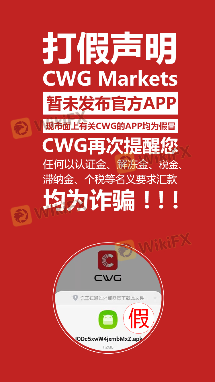 1.截至目前为止,CWG并未发布官方APP,现市场上有关CWG的APP均为假冒。任何关于开户、入金及取款等事宜,请以登陆CWG官网个人后台操作。